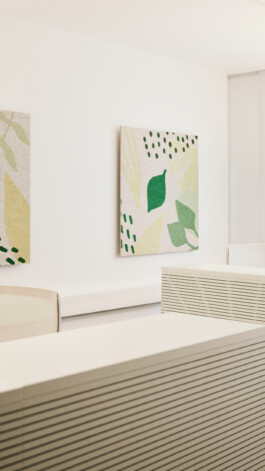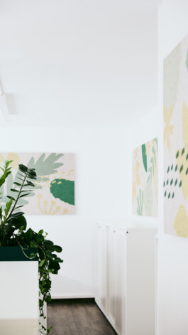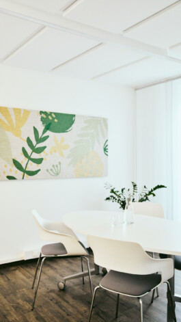 Die Raumakustik wird durch bedruckte Wandabsorber aus Schafwolle verbessert. Die Motive dafür sind durch den Grafiker der Kundin exklusiv angefertigt.