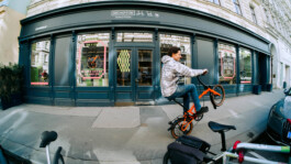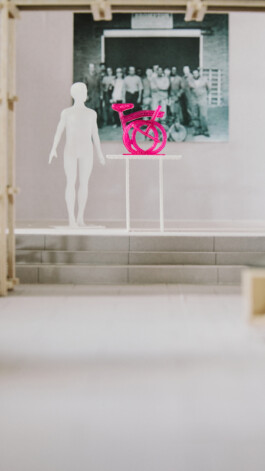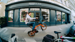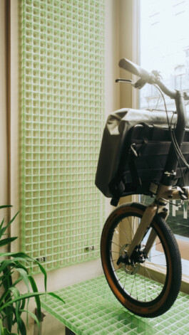 Ein zentrales Regal aus Fichtenholz bietet Platz für fünfzig gefaltete Räder in allen erhältlichen Farben und Variationen. Die integrierte LED-Beleuchtung inszeniert dabei jedes einzelne Faltrad.