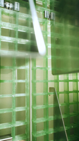 Grün transluzente GFK-Gitter in unterschiedlichen Formaten bilden ein kontrastierendes Elemente zum Fichtenholz, sie erzeugen starke Identität und strukturieren den Raum. Halterungen und Fachmodule zur Produktpräsentation werden frei im Raster des Gitters eingehängt.